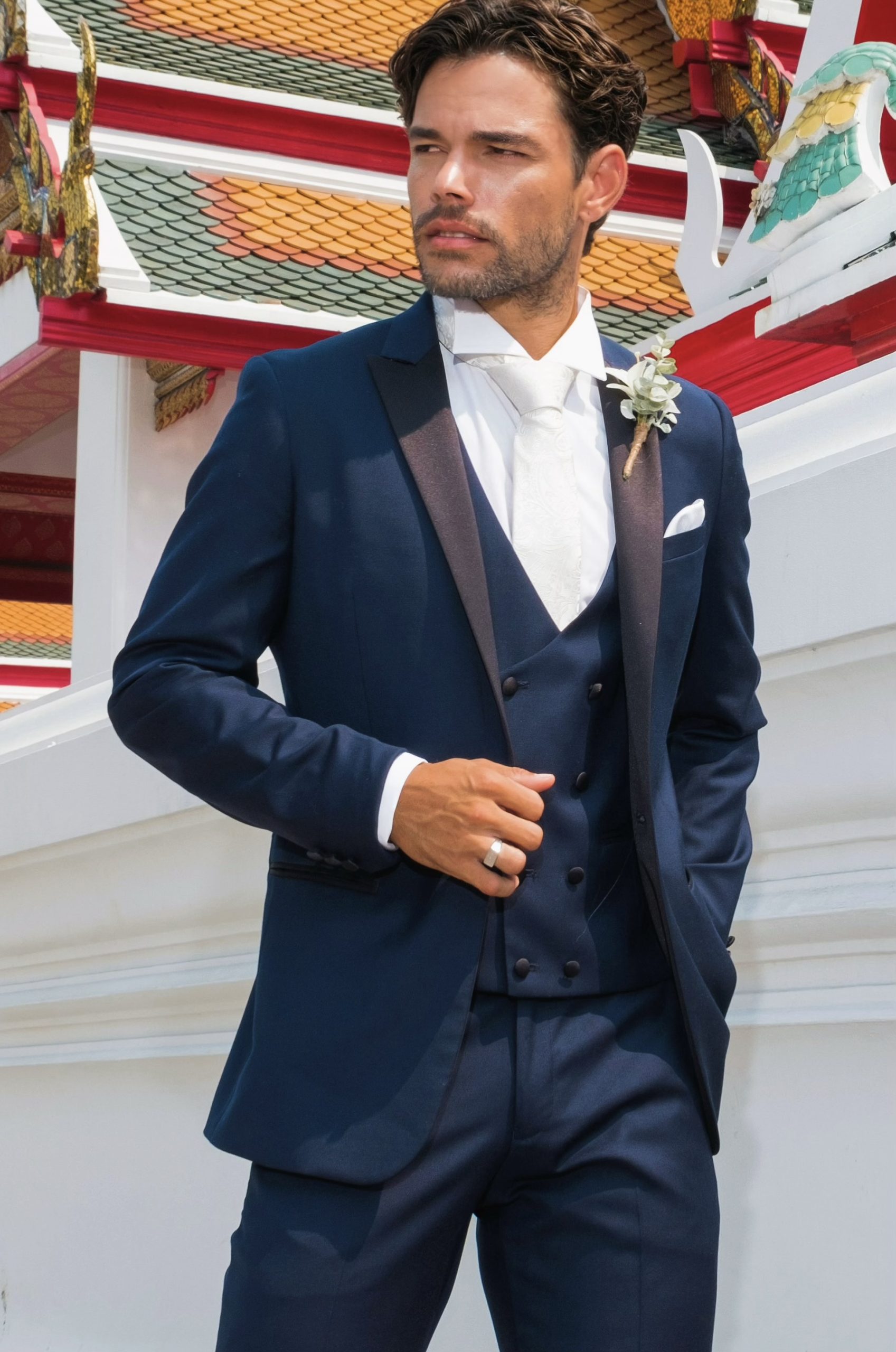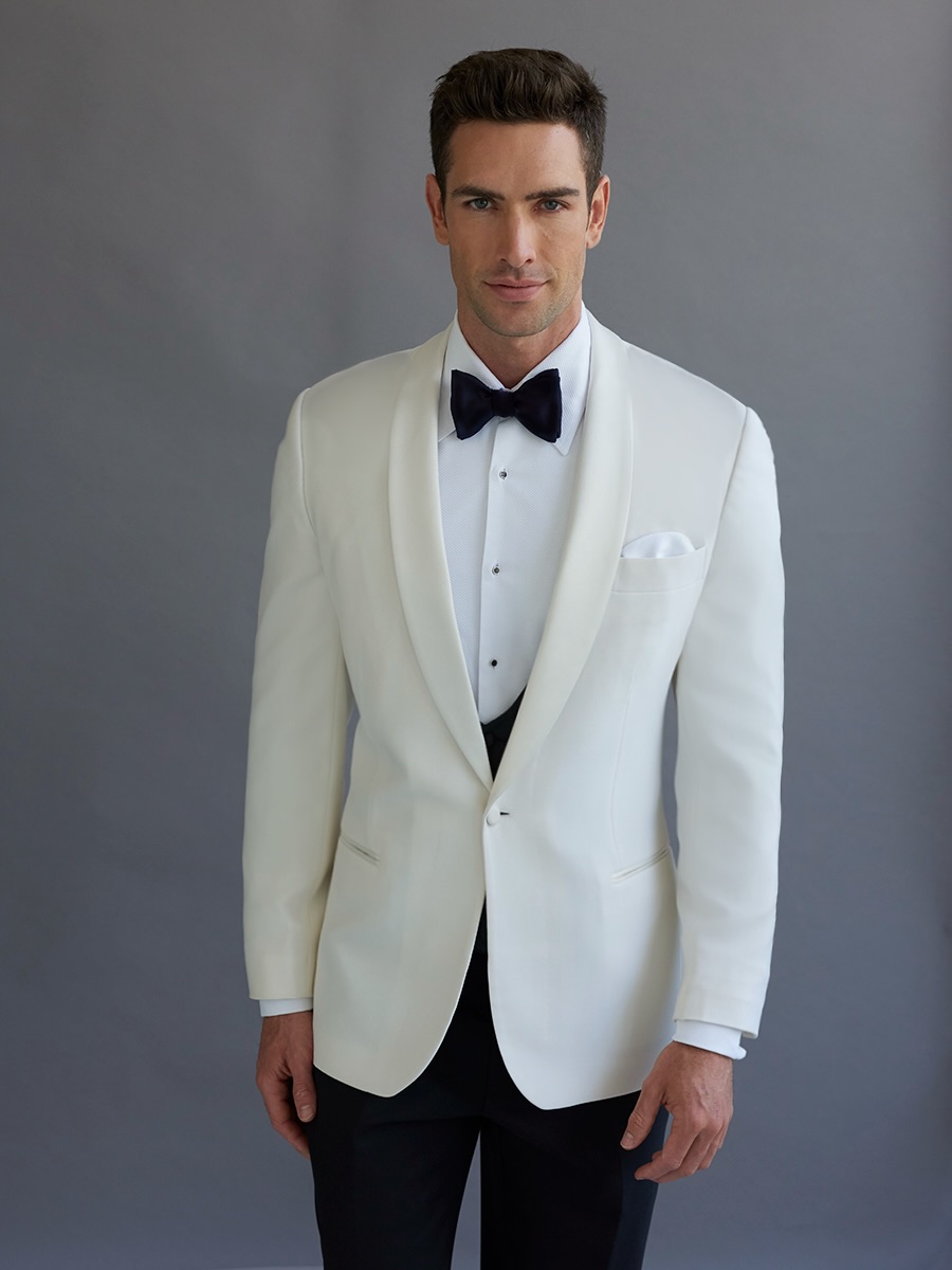 One button shawl satin lapel dinner suit. Ivory pure wool. Also available in peak laep and couble breasted.