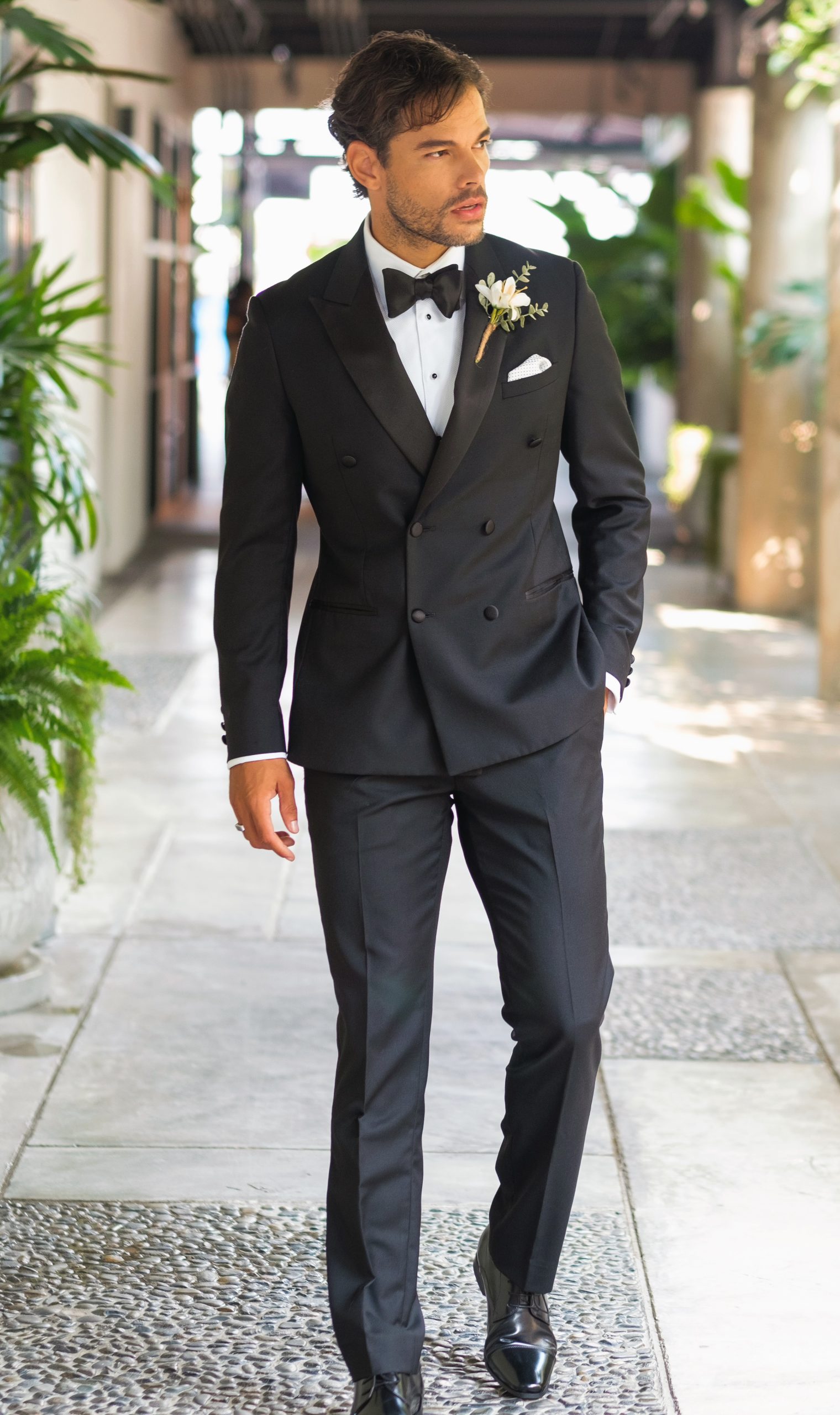Double Breasted Tuxedo. Black pure wool with satin peak lapel. Slim fit only