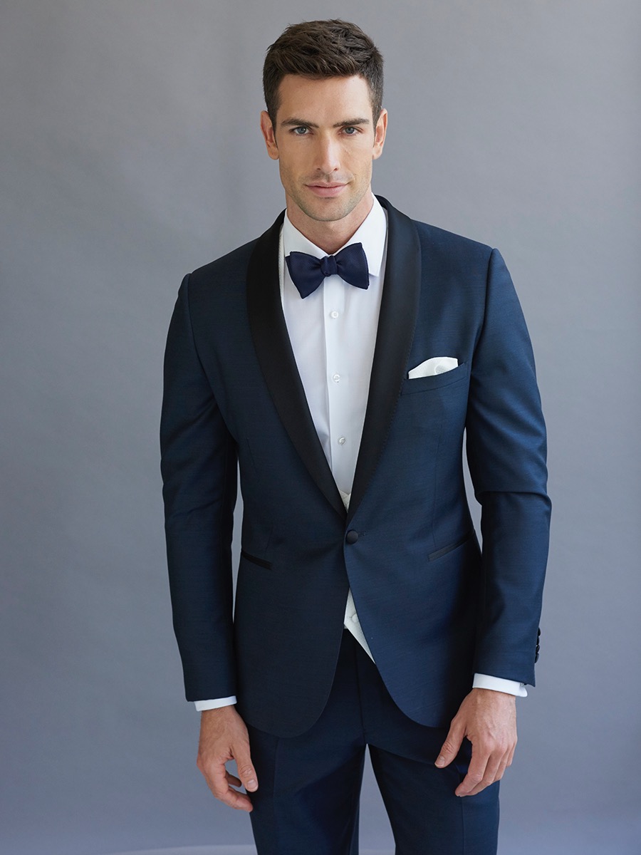 One button shawl satin lapel dinner suit. Navy pure wool. Slim Fit.