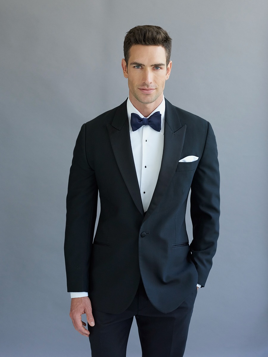 One button peak satin lapel dinner suit. Navy pure wool.