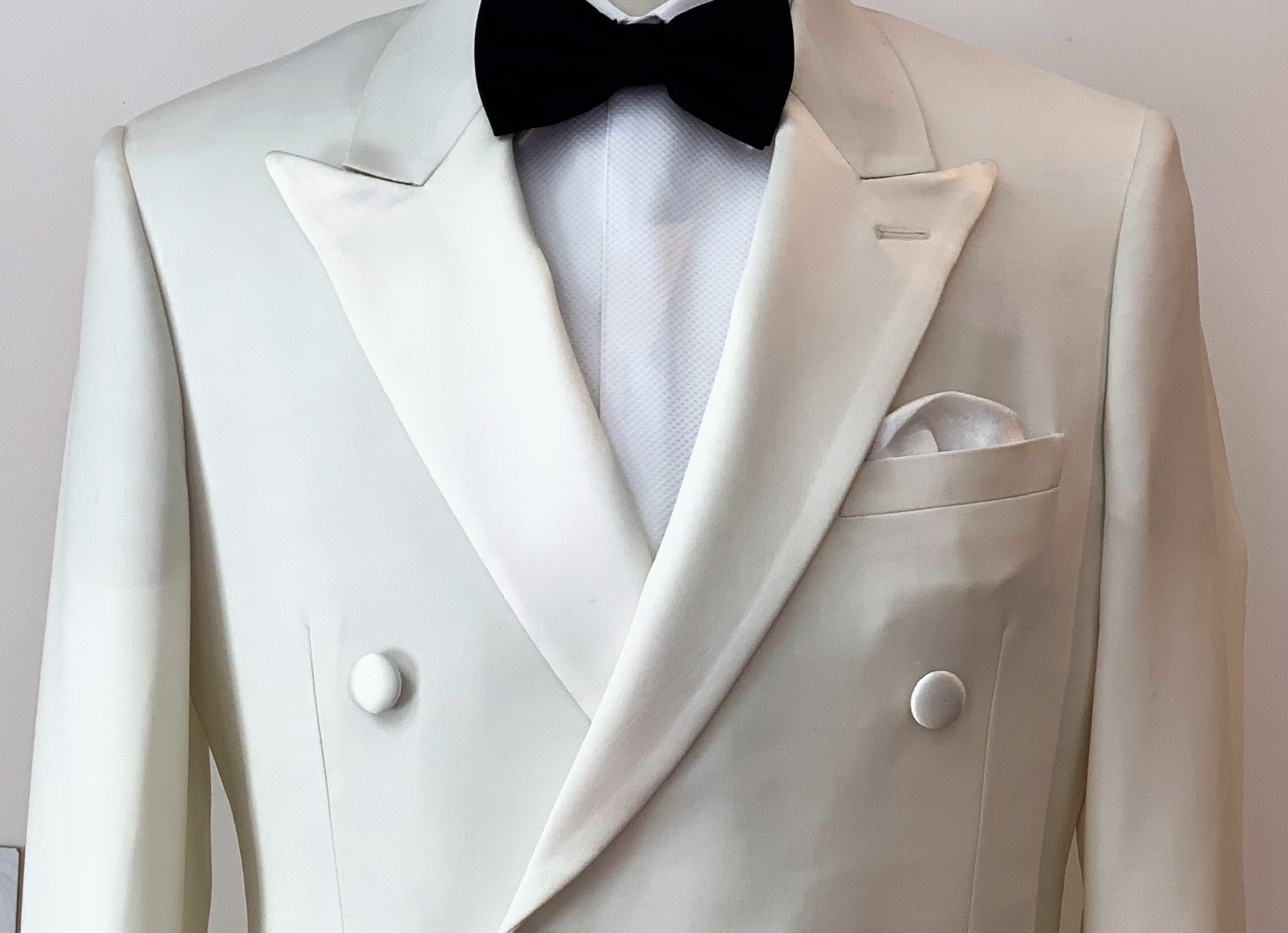 Ivory wool dinner jacket. Shawl and peak lapel single breasted. Peak double breasted.