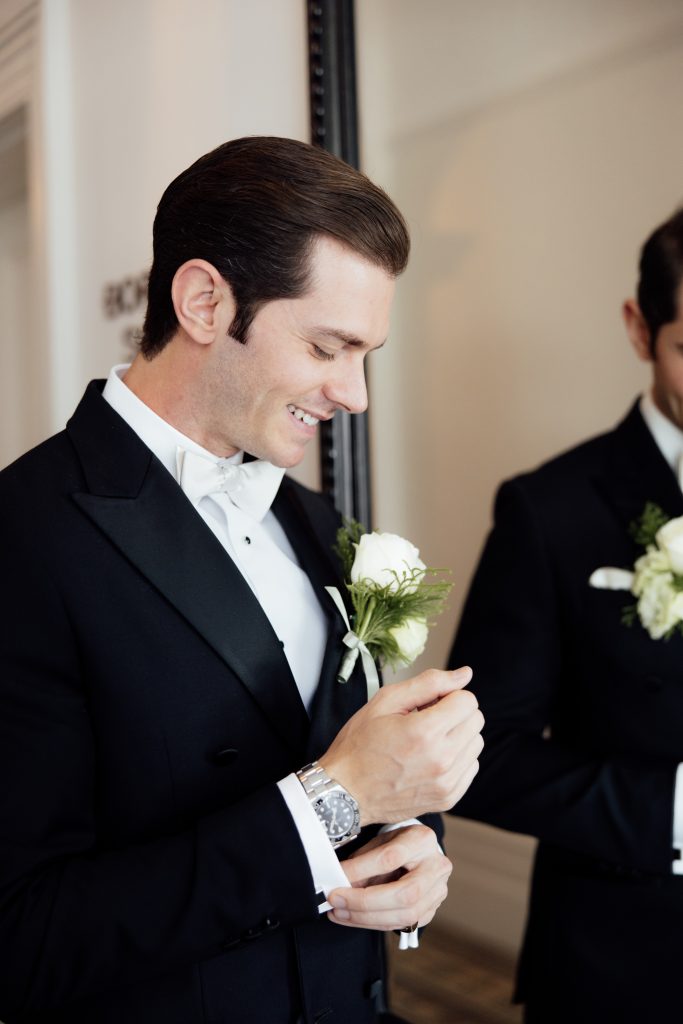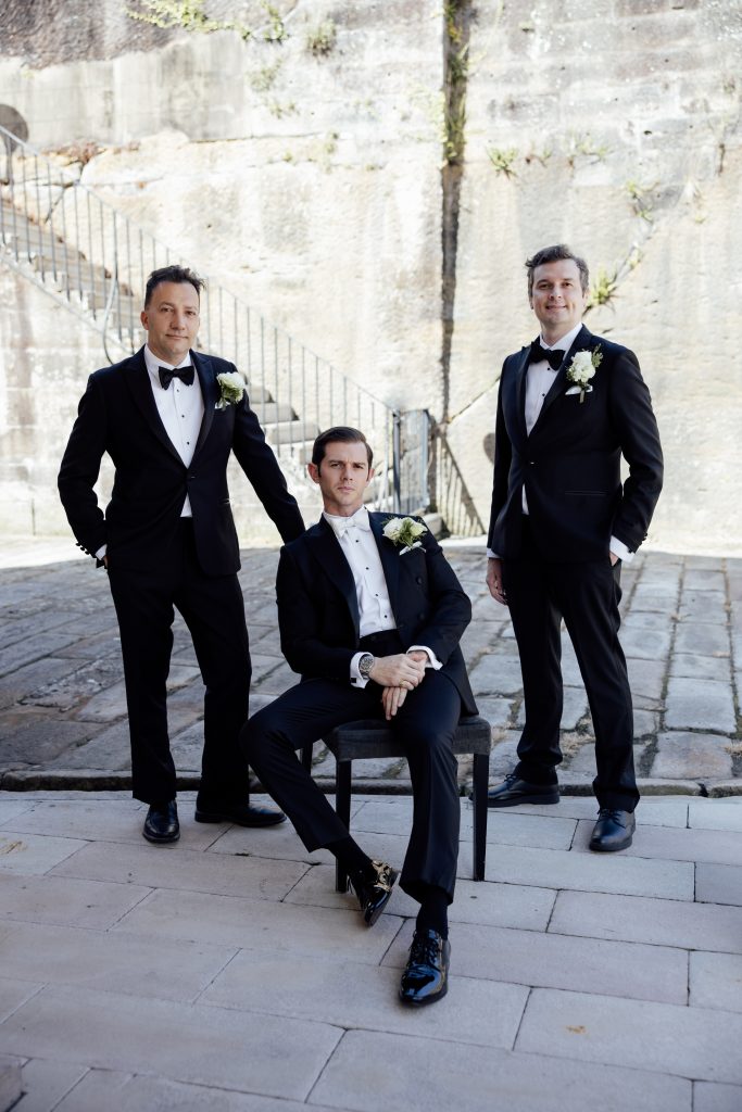 We chose to dress the groom in our Lucca double breasted black tuxedo with hand tied ivory silk bow. The groomsmen complimenting beautifully in Milano peak lapel tuxedos. With every detail thought out to perfection the result is a classic and timeless moment in time.